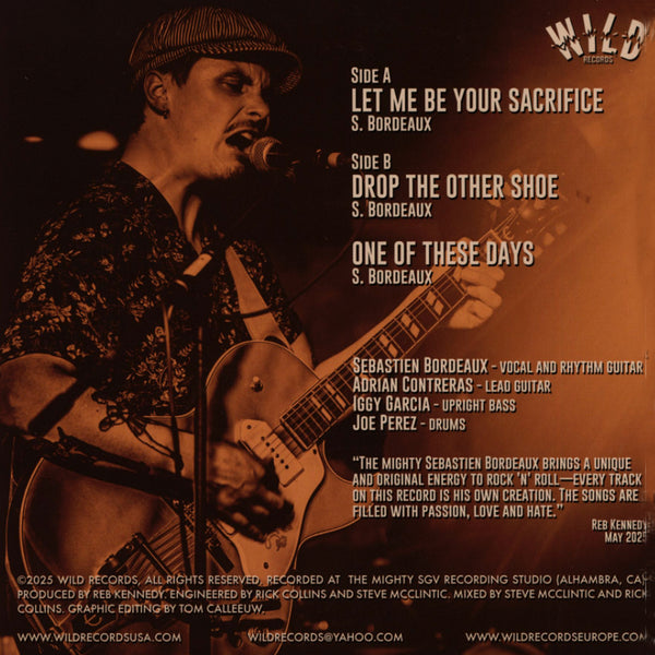ARTIST: Sebastien Bordeaux ALBUM TITLE: Let Me Be Your Sacrifice FORMAT: 7" Vinyl VINYL COLOR: classic glossy black PACKAGING: full color jacket LABEL: Wild Records - W2506 RELEASE DATE: 2025 MUSICIANS: Sebastien Bordeaux - vocals, rhythm guitar • Adrian Contrerad - lead guitar • Iggy Garcia - upright bass • Joe Perez - drums FILE UNDER: Roots Music drenched in Old Time Country, Blues, Rock n Roll, Western Swing, Bluegrass, and Jazz.